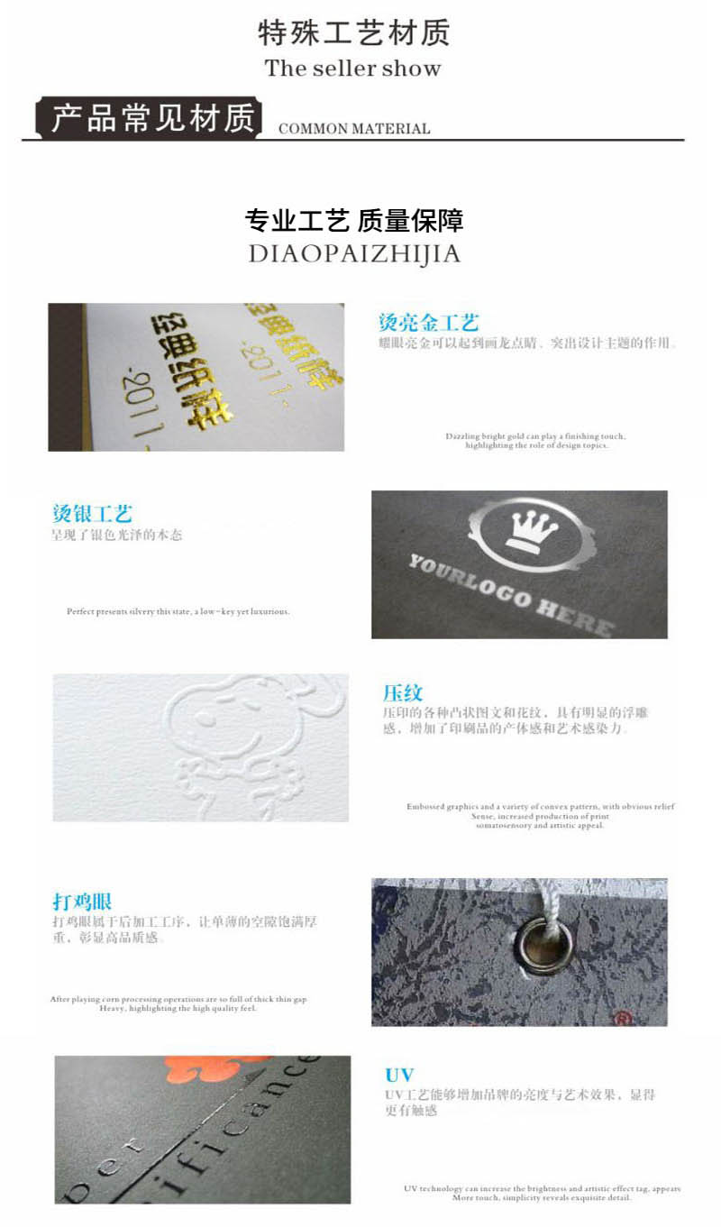 常用工藝:覆膜(啞膜、光膜)、壓紋、凹凸印、局部uv、燙銀、燙金、印專色(PANTONE色)、鏤空、鐳射、打孔、疊印、絲網印、透印、過光油、啞油等